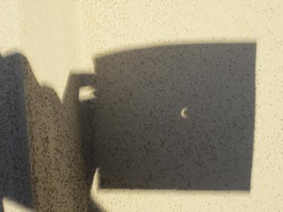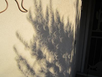 The eclipse does make some interesting shadows, so below I have photos of shadows of the eclipsed sun shining through our sage bush, casting shadows on the wall, and of the sun’s image through my quick and dirty pinhole viewer, which I also projected onto the same wall.